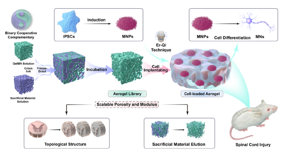 中國(guó)科學(xué)院廣州生物醫(yī)藥與健康研究院(以下簡(jiǎn)稱“廣州健康院”)納米轉(zhuǎn)化醫(yī)學(xué)研究組和華中科技大學(xué)協(xié)和醫(yī)院孫家明教授團(tuán)隊(duì)近期聯(lián)合在 Materials Today Bio發(fā)表了題為 “Aerogel library with varying porous structures and mechanics regulates motor neuron progenitor differentiation for spinal cord injury repair” 的研究論文。該研究構(gòu)建了一種微納結(jié)構(gòu)與力學(xué)性能可調(diào)控的多孔氣凝膠庫,揭示了仿生三維微環(huán)境的孔隙結(jié)構(gòu)與力學(xué)強(qiáng)度對(duì)人源誘導(dǎo)多能干細(xì)胞(hiPSCs)來源的運(yùn)動(dòng)神經(jīng)前體細(xì)胞(MNPs)譜系命運(yùn)調(diào)控作用和關(guān)鍵分子機(jī)制,并驗(yàn)證了其在脊髓損傷修復(fù)中的功能再生潛力。