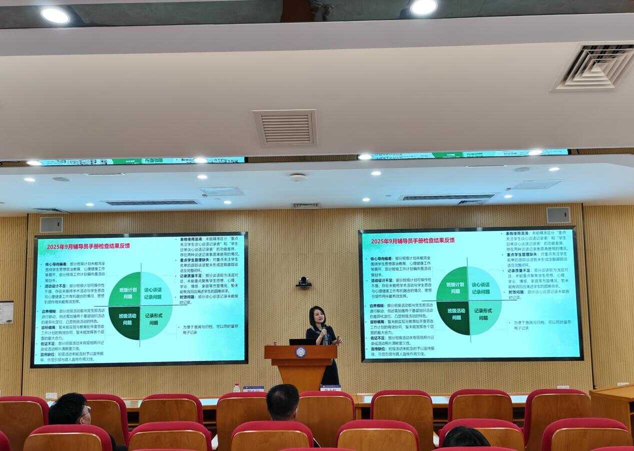 隨后,教育處負責人鄭小潔通報《輔導員工作手冊》核查情況,明確記錄規范并提出改進建議,分享學生思政及心理健康教育工作實用方法與技巧,切實推動學生管理與心理健康工作向標準化、精細化邁進。