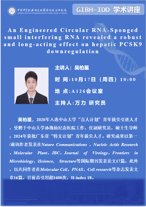 2024年10月17日學術講座:An Engineered Circular RNA-Sponged small interfering RNA revealed a robust and long-acting effect on hepatic PCSK9 downregulation