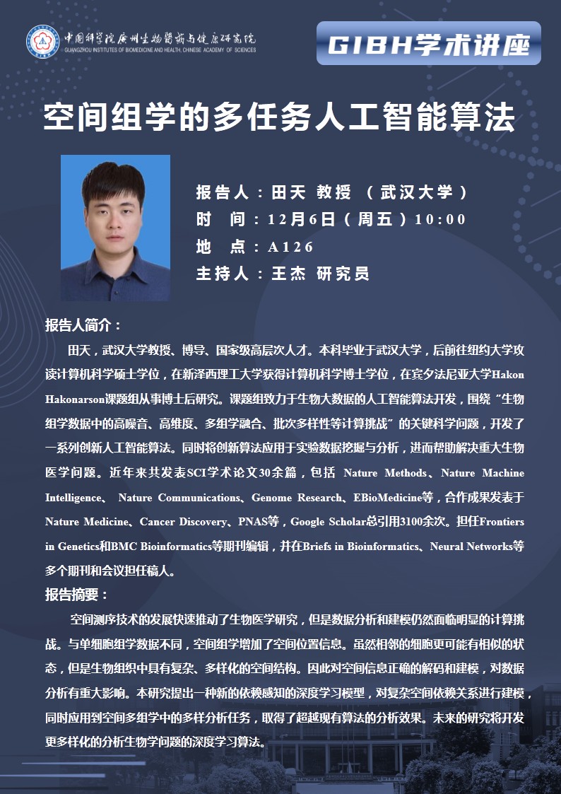 2024年12月6日學術講座:空間組學的多任務人工智能算法